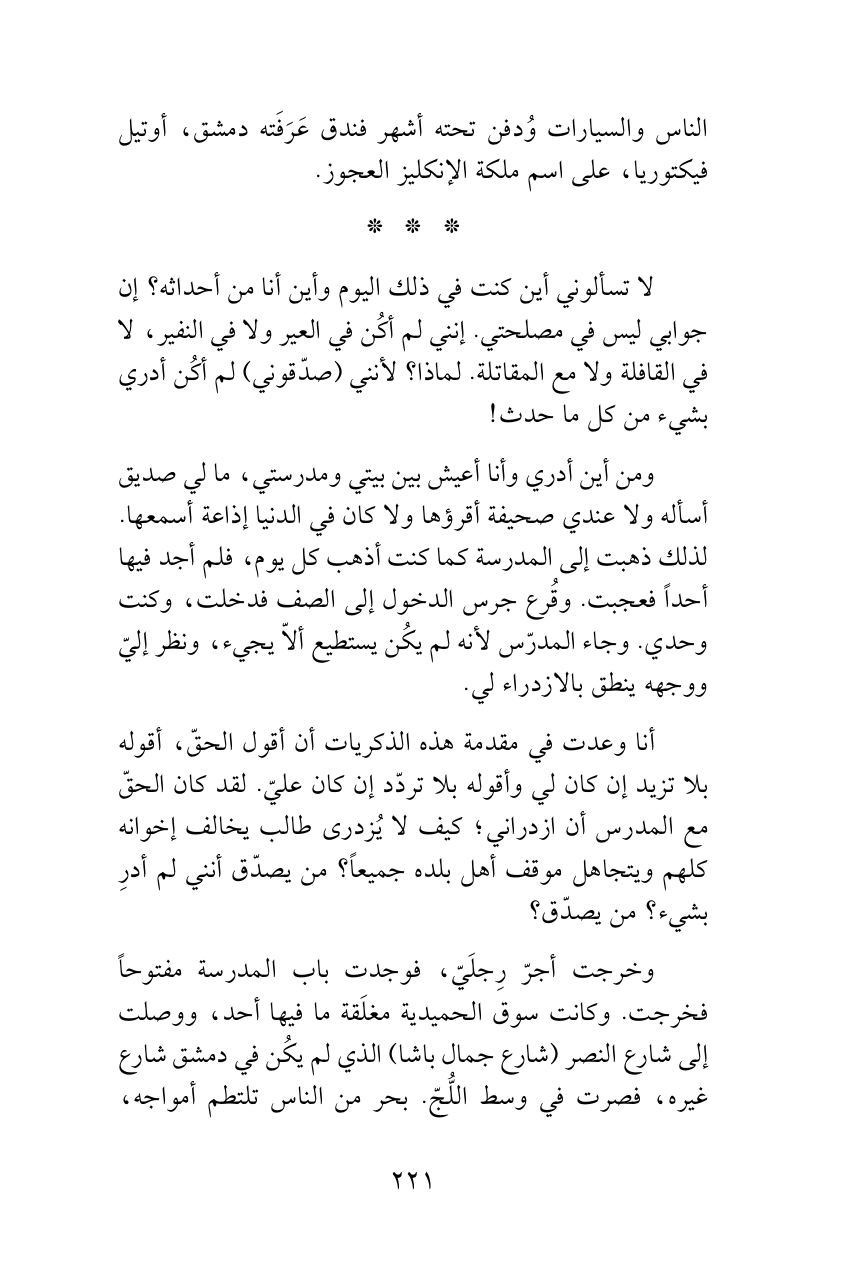 ومن أين أدري وأنا أعيش بين بيتي ومدرستي، ما لي صديق أسأله ولا عندي صحيفة أقرؤها ولا كان في الدنيا إذاعة أسمعها. لذلك ذهبت إلى المدرسة كما كنت أذهب كل يوم، فلم أجد فيها أحداً فعجبت. وقُرع جرس الدخول إلى الصف فدخلت، وكنت وحدي. وجاء المدرّس لأنه لم يكُن يستطيع ألاّ يجيء، ونظر إليّ ووجهه ينطق بالازدراء لي.
