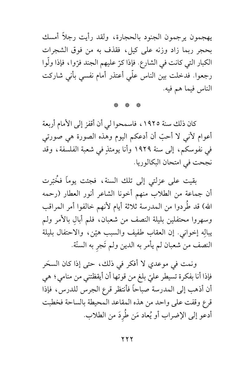 بقيت على عزلتي إلى تلك السنة، فجئت يوماً فخُبّرت أن جماعة من الطلاب منهم أخونا الشاعر أنور العطار (رحمه الله) قد طُردوا من المدرسة ثلاثة أيام لأنهم خالفوا أمر المراقب وسهروا محتفلين بليلة النصف من شعبان، فلم أبالِ بالأمر ولم يبالِه إخواني. إن العقاب طفيف والسبب هيّن، والاحتفال بليلة النصف من شعبان لم يأمر به الدين ولم تَجرِ به السنّة.
