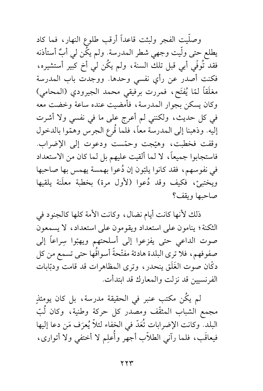 وصلّيت الفجر ولبثت قاعداً أرقب طلوع النهار، فما كاد يطلع حتى ولّيت وجهي شطر المدرسة. ولم يكُن لي أبٌ أستأذنه فقد تُوفّي أبي قبل تلك السنة، ولم يكُن لي أخ كبير أستشيره، فكنت أصدر عن رأي نفسي وحدها. ووجدت باب المدرسة مغلَقاً لمّا يُفتَح، فمررت برفيقي محمد الجيرودي (المحامي) وكان يسكن بجوار المدرسة، فأمضيت عنده ساعة وخضت معه في كل حديث، ولكنني لم أعرج على ما في نفسي ولا أشرت إليه. وذهبنا إلى المدرسة معاً، فلما قُرع الجرس وهمّوا بالدخول وقفت فخطبت، وهيّجت وحمّست ودعوت إلى الإضراب. فاستجابوا جميعاً، لا لما ألقيت عليهم بل لما كان من الاستعداد في نفوسهم، فقد كانوا يلبّون إن دُعوا بهمسة يهمس بها صاحبها ويختبئ، فكيف وقد دُعوا (لأول مرة) بخطبة معلَنة يلقيها صاحبها ويقف؟