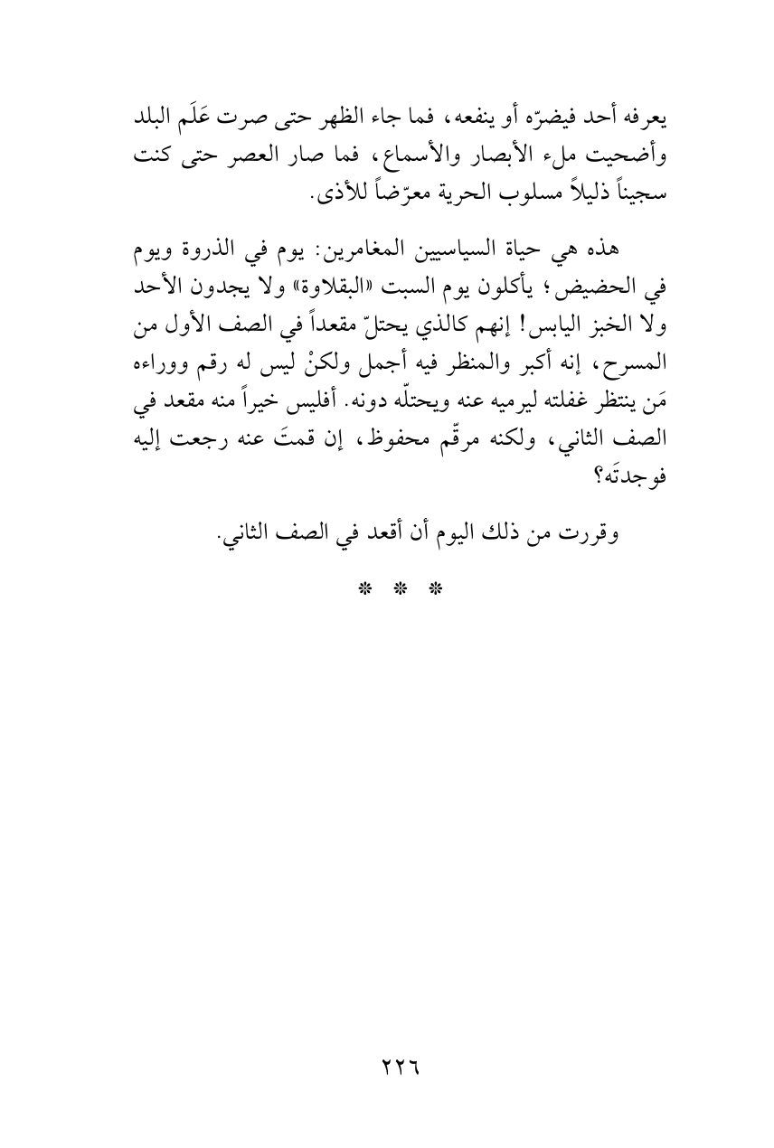 هذه هي حياة السياسيين المغامرين: يوم في الذروة ويوم في الحضيض؛ يأكلون يوم السبت «البقلاوة» ولا يجدون الأحد ولا الخبز اليابس! إنهم كالذي يحتلّ مقعداً في الصف الأول من المسرح، إنه أكبر والمنظر فيه أجمل ولكنْ ليس له رقم ووراءه مَن ينتظر غفلته ليرميه عنه ويحتلّه دونه. أفليس خيراً منه مقعد في الصف الثاني، ولكنه مرقّم محفوظ، إن قمتَ عنه رجعت إليه فوجدتَه؟