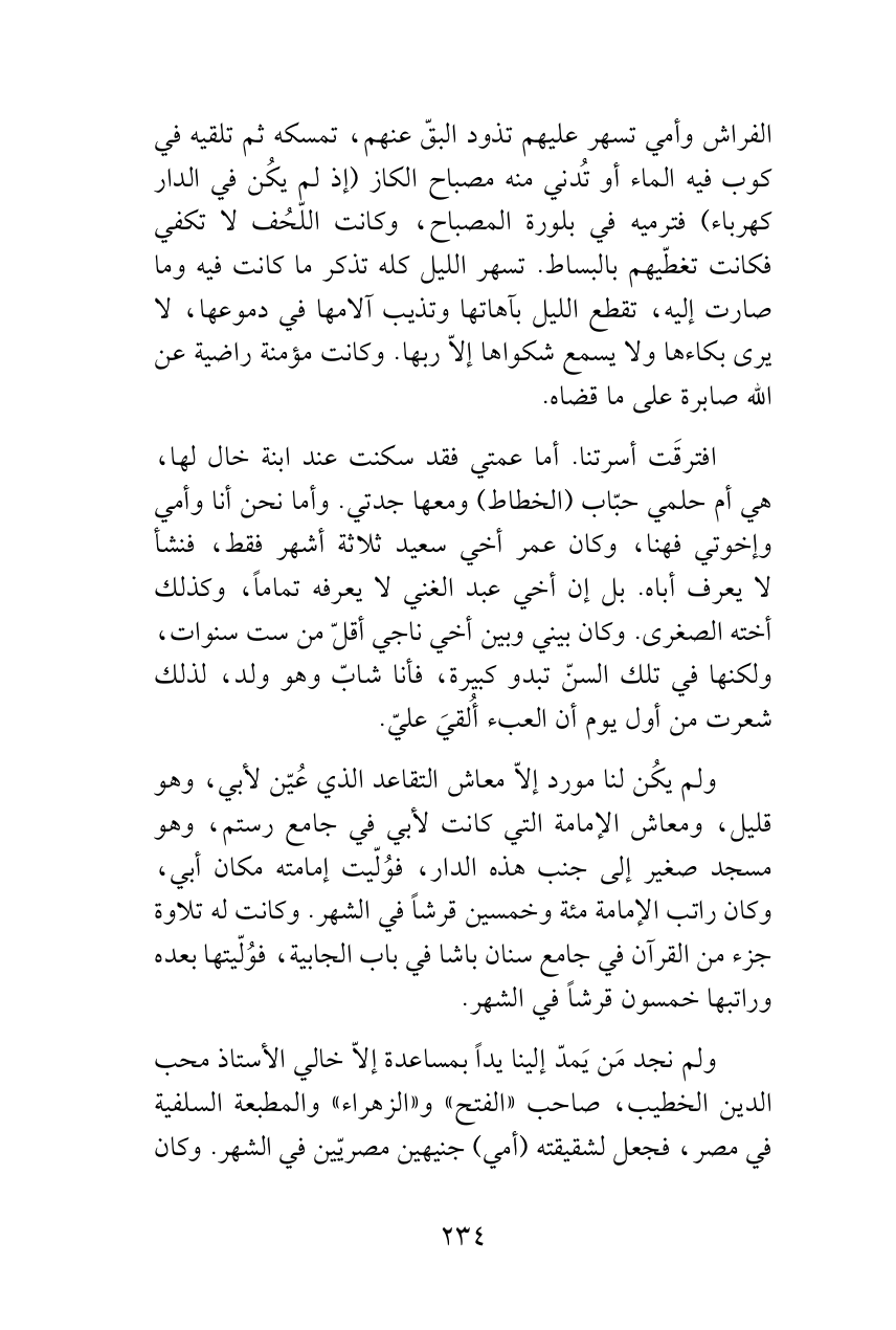 ولم نجد مَن يَمدّ إلينا يداً بمساعدة إلاّ خالي الأستاذ محب الدين الخطيب، صاحب «الفتح» و «الزهراء» والمطبعة السلفية في مصر، فجعل لشقيقته (أمي) جنيهين مصريّين في الشهر. وكان