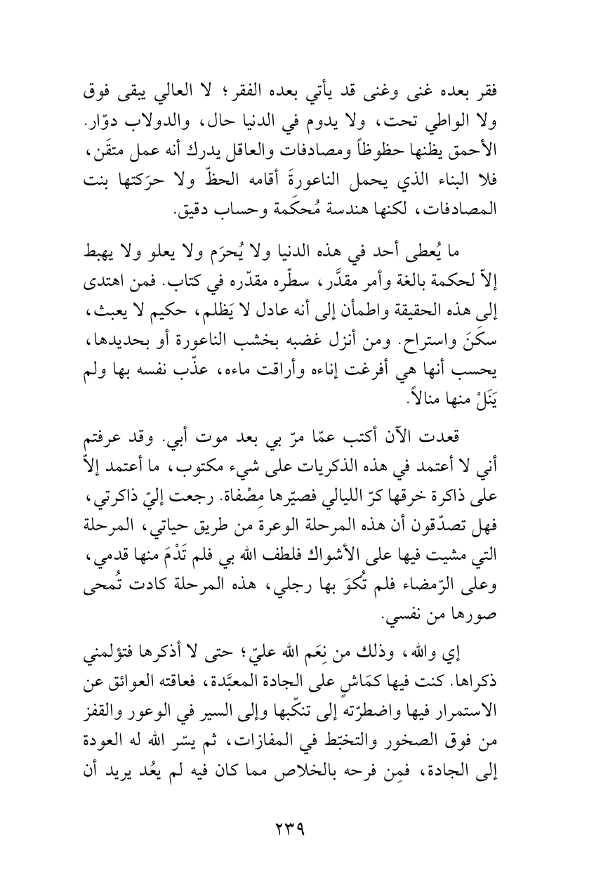 ما يُعطى أحد في هذه الدنيا ولا يُحرَم ولا يعلو ولا يهبط إلاّ لحكمة بالغة وأمر مقدَّر، سطّره مقدّره في كتاب. فمن اهتدى إلى هذه الحقيقة واطمأن إلى أنه عادل لا يَظلم، حكيم لا يعبث، سكَنَ واستراح. ومن أنزل غضبه بخشب الناعورة أو بحديدها، يحسب أنها هي أفرغت إناءه وأراقت ماءه، عذّب نفسه بها ولم يَنَلْ منها منالاً.