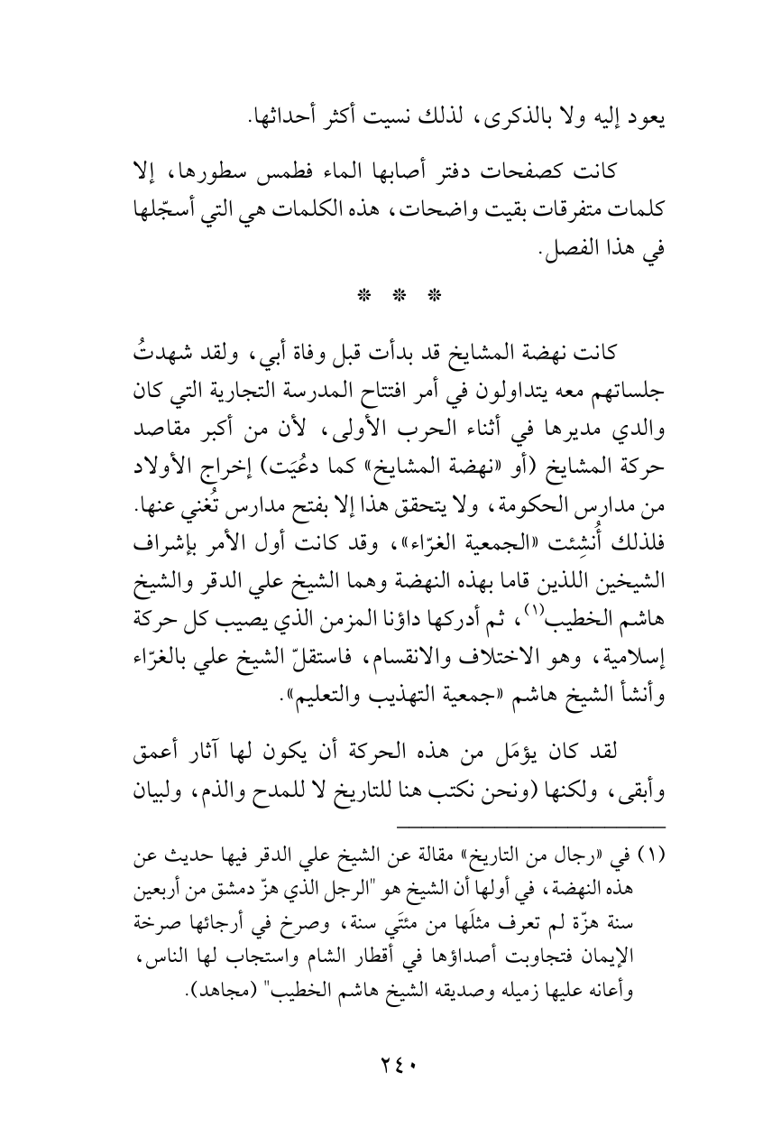 كانت نهضة المشايخ قد بدأت قبل وفاة أبي، ولقد شهدتُ جلساتهم معه يتداولون في أمر افتتاح المدرسة التجارية التي كان والدي مديرها في أثناء الحرب الأولى، لأن من أكبر مقاصد حركة المشايخ (أو «نهضة المشايخ» كما دعُيَت) إخراج الأولاد من مدارس الحكومة، ولا يتحقق هذا إلا بفتح مدارس تُغني عنها. فلذلك أُنشِئت «الجمعية الغرّاء»، وقد كانت أول الأمر بإشراف الشيخين اللذين قاما بهذه النهضة وهما الشيخ علي الدقر والشيخ هاشم الخطيب (¬1)، ثم أدركها داؤنا المزمن الذي يصيب كل حركة إسلامية، وهو الاختلاف والانقسام، فاستقلّ الشيخ علي بالغرّاء وأنشأ الشيخ هاشم «جمعية التهذيب والتعليم».