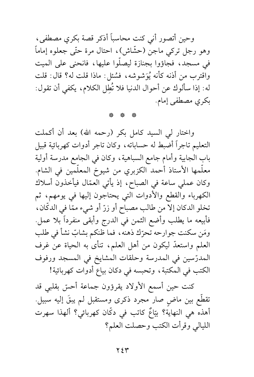 كنت حين أسمع الأولاد يقرؤون جماعة أحسّ بقلبي قد تقطّع بين ماضٍ صار مجرد ذكرى ومستقبل لم يبقَ إليه سبيل. أهذه هي النهاية؟ بيّاعٌ كاتب في دكّان كهربائي؟ ألهذا سهرت الليالي وقرأت الكتب وحصلت العلم؟