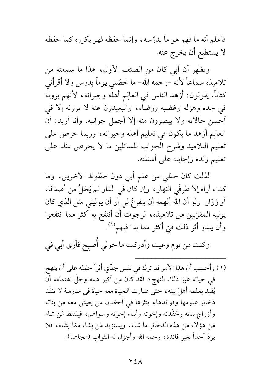 لذلك كان حظي من علم أبي دون حظوظ الآخرين، وما كنت أراه إلا طرفَي النهار، وإن كان في الدار لم يَخلُ من أصدقاء أو زوّار. ولو أن الله ألهمه أن يتفرغ لي أو أن يوليني مثل الذي كان يوليه المقرّبين من تلاميذه، لرجوت أن أنتفع به أكثر مما انتفعوا وأن يبدو أثر ذلك فيّ أكثر مما بدا فيهم (¬1).