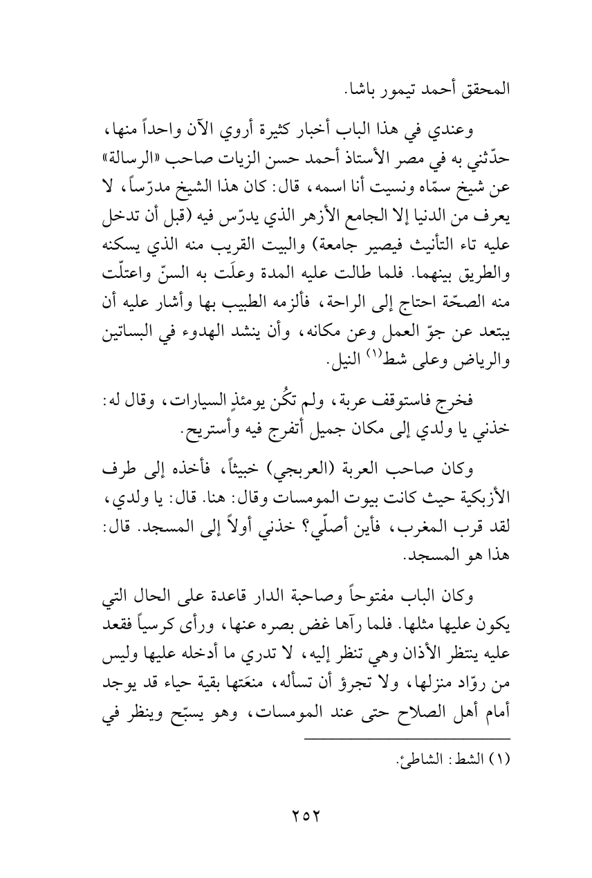 وعندي في هذا الباب أخبار كثيرة أروي الآن واحداً منها، حدّثني به في مصر الأستاذ أحمد حسن الزيات صاحب «الرسالة» عن شيخ سمّاه ونسيت أنا اسمه، قال: كان هذا الشيخ مدرّساً، لا يعرف من الدنيا إلا الجامع الأزهر الذي يدرّس فيه (قبل أن تدخل عليه تاء التأنيث فيصير جامعة) والبيت القريب منه الذي يسكنه والطريق بينهما. فلما طالت عليه المدة وعلَت به السنّ واعتلّت منه الصحّة احتاج إلى الراحة، فألزمه الطبيب بها وأشار عليه أن يبتعد عن جوّ العمل وعن مكانه، وأن ينشد الهدوء في البساتين والرياض وعلى شط (¬1) النيل.