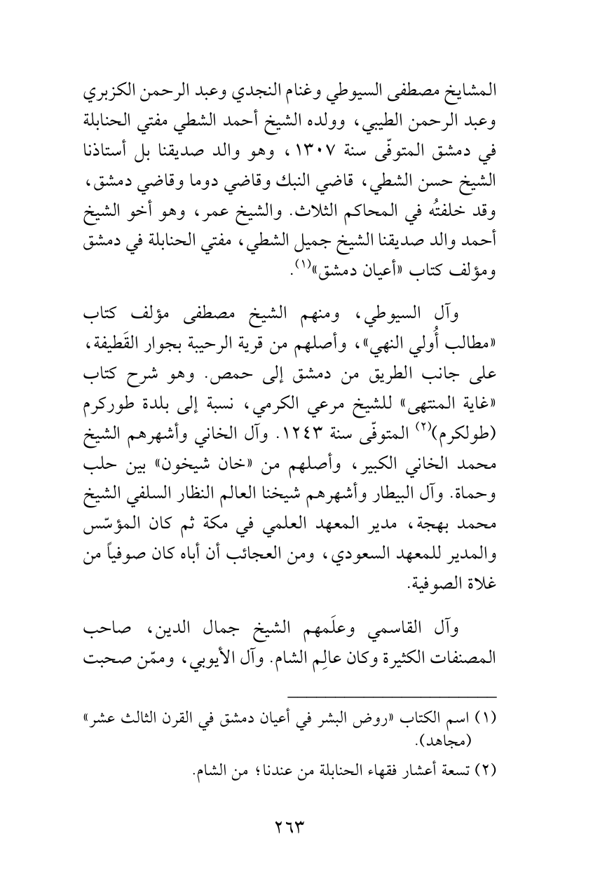 وآل السيوطي، ومنهم الشيخ مصطفى مؤلف كتاب «مطالب أُولي النهي»، وأصلهم من قرية الرحيبة بجوار القَطيفة، على جانب الطريق من دمشق إلى حمص. وهو شرح كتاب «غاية المنتهى» للشيخ مرعي الكرمي، نسبة إلى بلدة طوركرم (طولكرم) (¬2) المتوفّى سنة 1243. وآل الخاني وأشهرهم الشيخ محمد الخاني الكبير، وأصلهم من «خان شيخون» بين حلب وحماة. وآل البيطار وأشهرهم شيخنا العالم النظار السلفي الشيخ محمد بهجة، مدير المعهد العلمي في مكة ثم كان المؤسّس والمدير للمعهد السعودي، ومن العجائب أن أباه كان صوفياً من غلاة الصوفية.