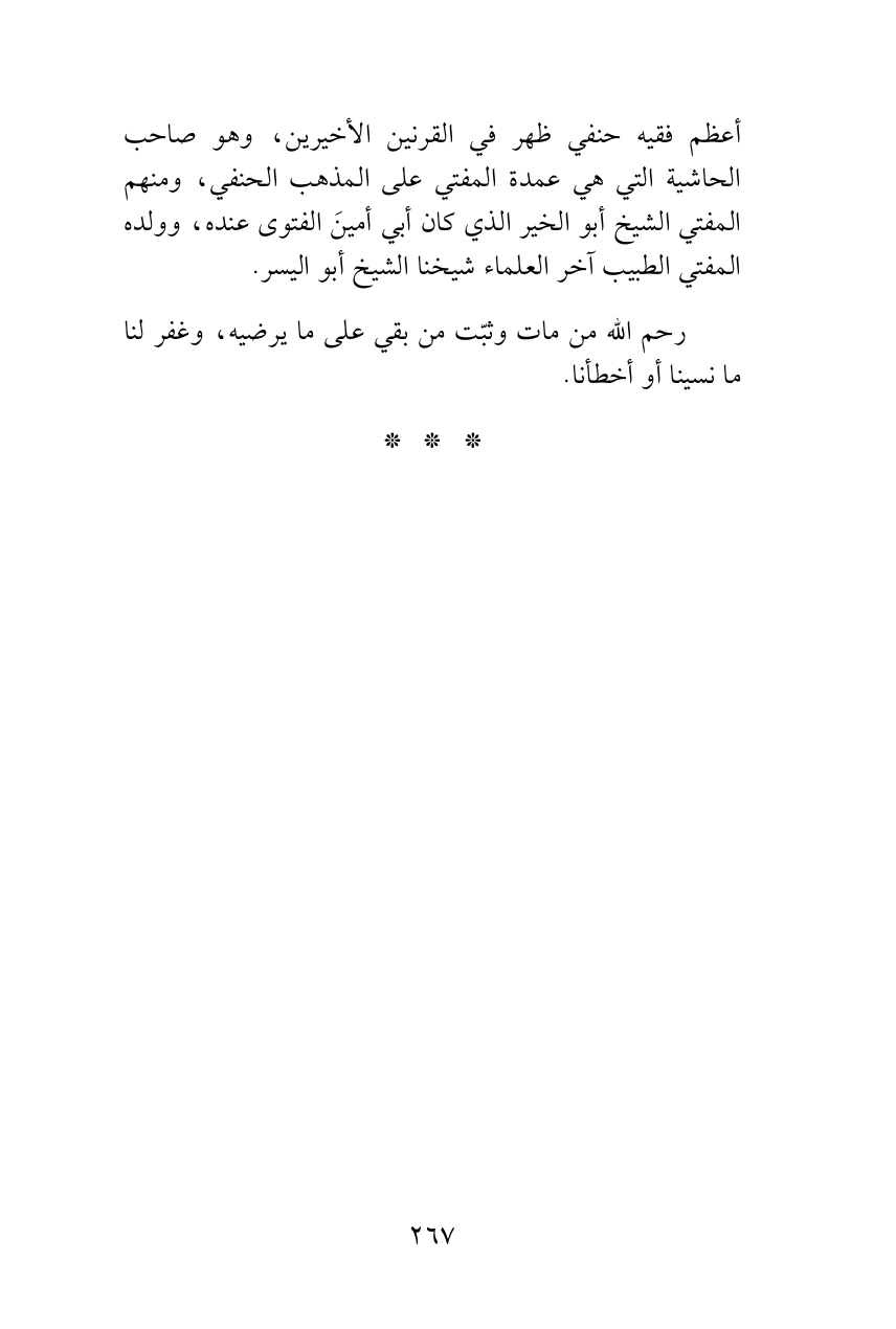 أعظم فقيه حنفي ظهر في القرنين الأخيرين، وهو صاحب الحاشية التي هي عمدة المفتي على المذهب الحنفي، ومنهم المفتي الشيخ أبو الخير الذي كان أبي أمينَ الفتوى عنده، وولده المفتي الطبيب آخر العلماء شيخنا الشيخ أبو اليسر.