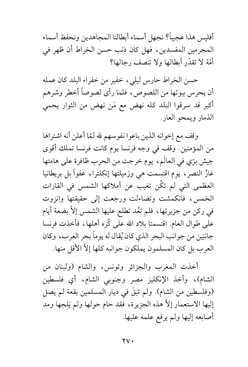 أفليس هذا عجيباً؟ نجهل أسماء أبطالنا المجاهدين ونحفظ أسماء المجرمين المفسدين، فهل كان ذنب حسن الخراط أن ظهر في أمّة لا تقدّر أبطالها ولا تنصف رجالها؟