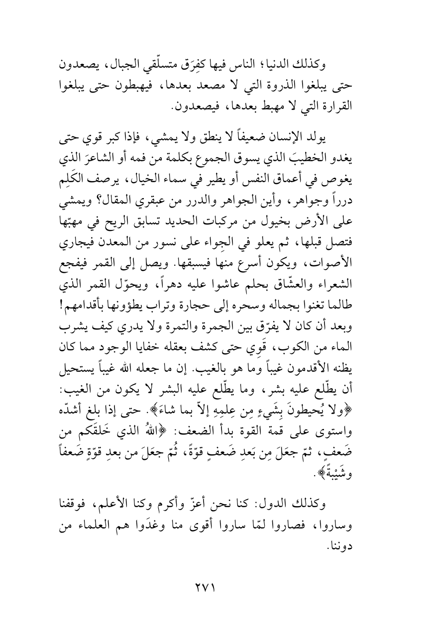 يولد الإنسان ضعيفاً لا ينطق ولا يمشي، فإذا كبر قوي حتى يغدو الخطيبَ الذي يسوق الجموع بكلمة من فمه أو الشاعرَ الذي يغوص في أعماق النفس أو يطير في سماء الخيال، يرصف الكَلِم درراً وجواهر، وأين الجواهر والدرر من عبقري المقال؟ ويمشي على الأرض بخيول من مركبات الحديد تسابق الريح في مهبّها فتصل قبلها، ثم يعلو في الجِواء على نسور من المعدن فيجاري الأصوات، ويكون أسرع منها فيسبقها. ويصل إلى القمر فيفجع الشعراء والعشّاق بحلم عاشوا عليه دهراً، ويحوّل القمر الذي طالما تغنوا بجماله وسحره إلى حجارة وتراب يطؤونها بأقدامهم! وبعد أن كان لا يفرّق بين الجمرة والتمرة ولا يدري كيف يشرب الماء من الكوب، قَوِي حتى كشف بعقله خفايا الوجود مما كان يظنه الأقدمون غيباً وماهو بالغيب. إن ما جعله الله غيباً يستحيل أن يطّلع عليه بشر، وما يطّلع عليه البشر لا يكون من الغيب: {ولا يُحيطونَ بِشَيءٍ مِن عِلمِهِ إلاّ بما شاءَ}. حتى إذا بلغ أشدّه واستوى على قمة القوة بدأ الضعف: {اللهُ الذي خَلقَكم من ضَعفٍ، ثمّ جعَلَ مِن بَعدِ ضَعفٍ قوّةً، ثُمّ جعَلَ من بعدِ قوّةٍ ضَعفاً وشَيْبةً}.