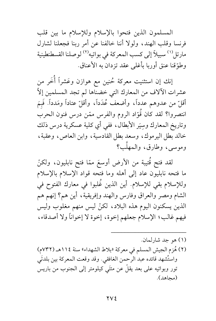 المسلمون الذين فتحوا بالإسلام وللإسلام ما بين قلب فرنسا وقلب الهند، ولولا أننا خالفنا عن أمر ربنا فجعلنا لشارل مارتل (¬1) سبيلاً إلى كسب المعركة في بواتيه (¬2) لوصلنا القسطنطينية وطوّقنا عنق أوربا بأغلى عقد تزدان به الأعناق.