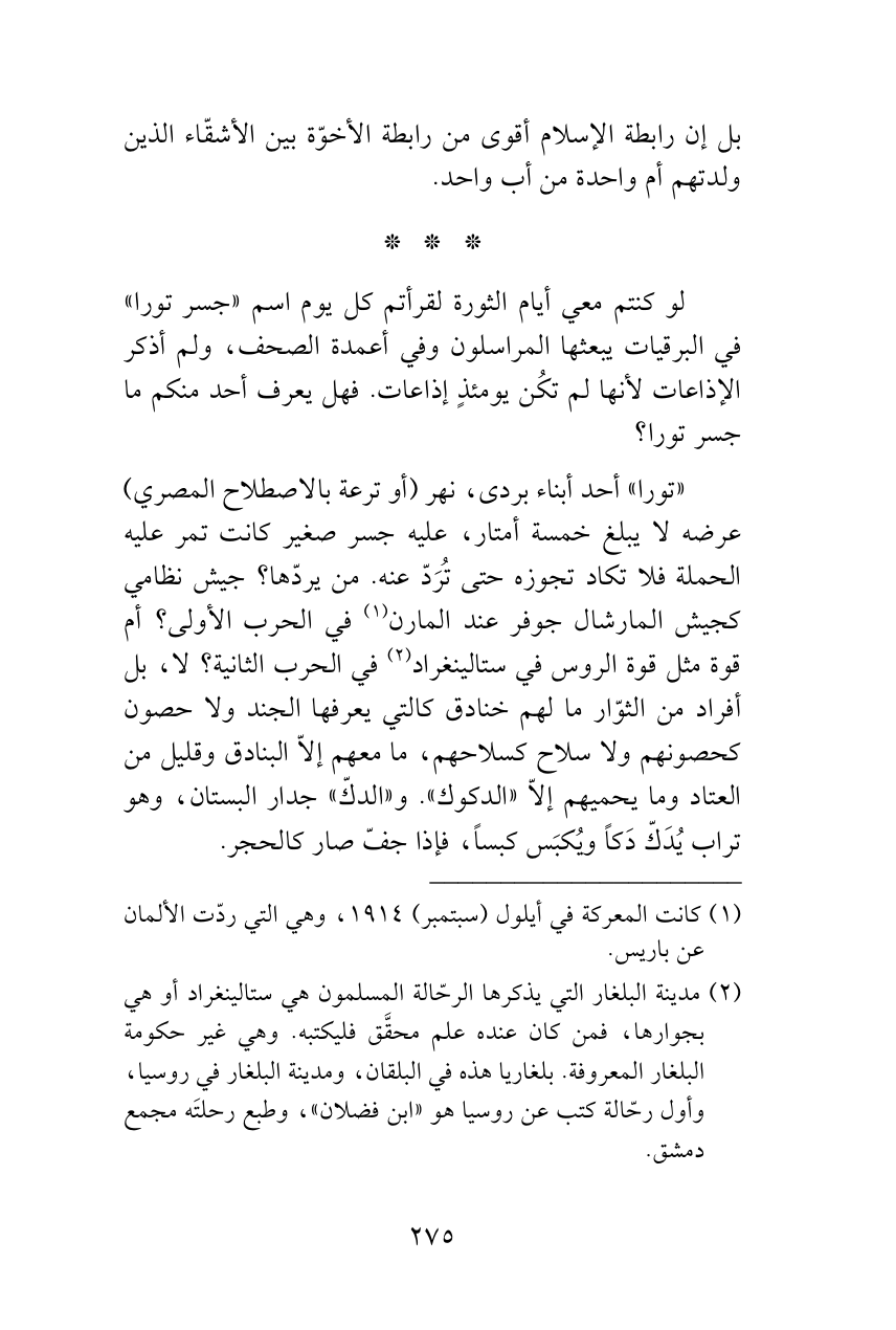 (¬2) مدينة البلغار التي يذكرها الرحّالة المسلمون هي ستالينغراد أو هي بجوارها، فمن كان عنده علم محقَّق فليكتبه. وهي غير حكومة البلغار المعروفة. بلغاريا هذه في البلقان، ومدينة البلغار في روسيا، وأول رحّالة كتب عن روسيا هو «ابن فضلان»، وطبع رحلتَه مجمع دمشق.
