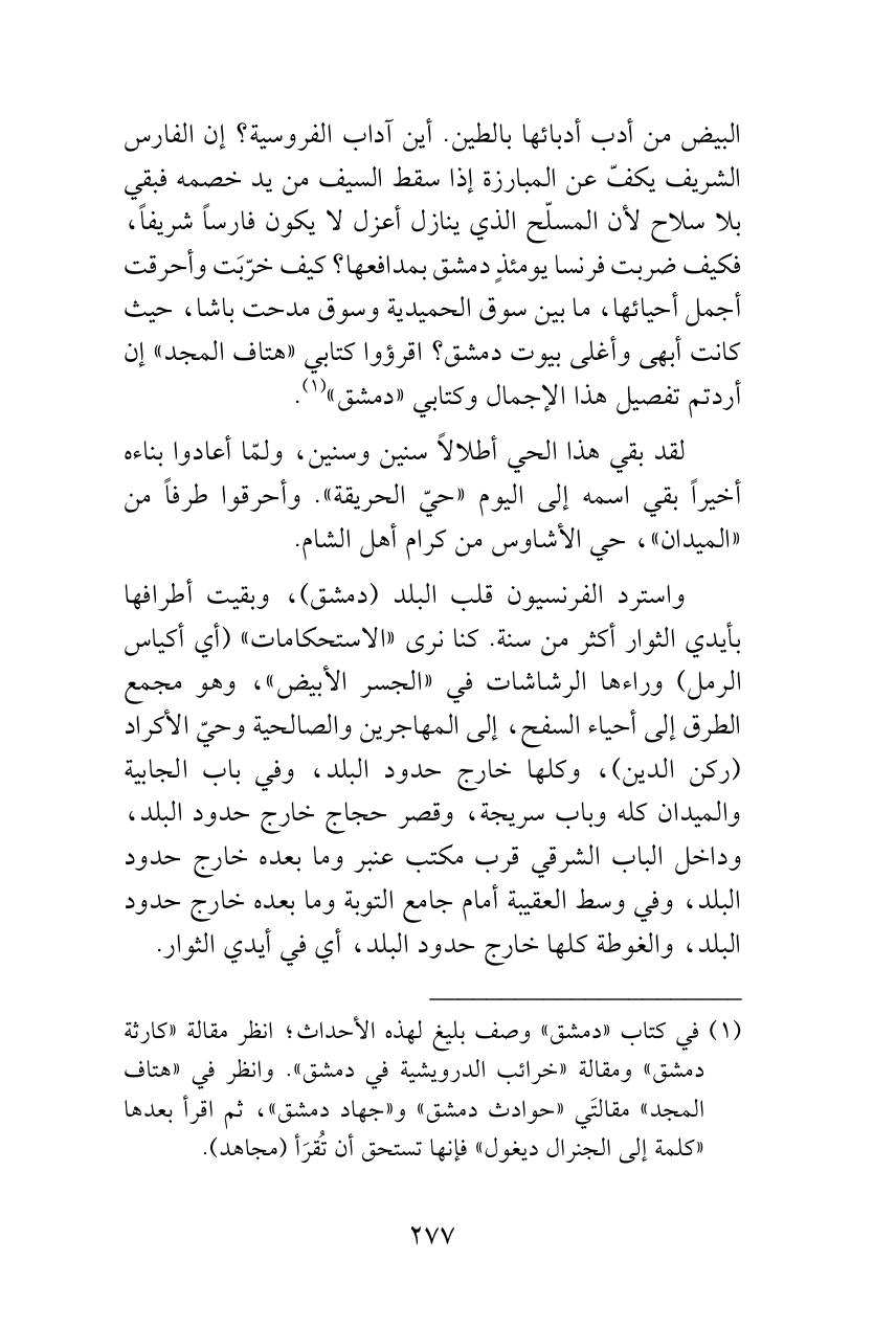 (¬1) في كتاب «دمشق» وصف بليغ لهذه الأحداث؛ انظر مقالة «كارثة دمشق» ومقالة «خرائب الدرويشية في دمشق». وانظر في «هتاف المجد» مقالتَي «حوادث دمشق» و «جهاد دمشق»، ثم اقرأ بعدها «كلمة إلى الجنرال ديغول» فإنها تستحق أن تُقرَأ (مجاهد).