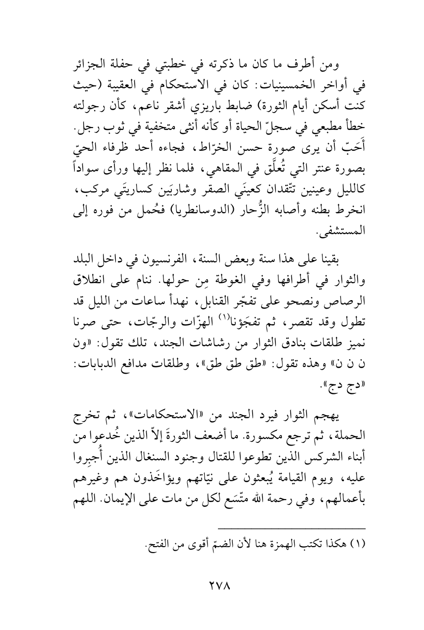 ومن أطرف ما كان ما ذكرته في خطبتي في حفلة الجزائر في أواخر الخمسينيات: كان في الاستحكام في العقيبة (حيث كنت أسكن أيام الثورة) ضابط باريزي أشقر ناعم، كأن رجولته خطأ مطبعي في سجلّ الحياة أو كأنه أنثى متخفية في ثوب رجل. أَحَبّ أن يرى صورة حسن الخرّاط، فجاءه أحد ظرفاء الحيّ بصورة عنتر التي تُعلَّق في المقاهي، فلما نظر إليها ورأى سواداً كالليل وعينين تتّقدان كعينَي الصقر وشاربَين كساريتَي مركب، انخرط بطنه وأصابه الزُّحار (الدوسانطريا) فحُمل من فوره إلى المستشفى.