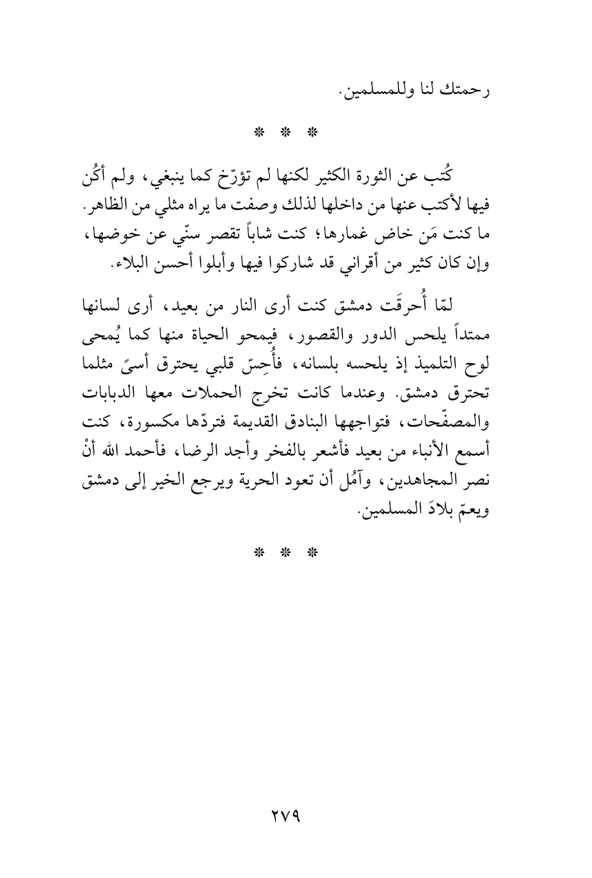 لمّا أُحرقَت دمشق كنت أرى النار من بعيد، أرى لسانها ممتداً يلحس الدور والقصور، فيمحو الحياة منها كما يُمحى لوح التلميذ إذ يلحسه بلسانه، فأُحِسّ قلبي يحترق أسىً مثلما تحترق دمشق. وعندما كانت تخرج الحملات معها الدبابات والمصفّحات، فتواجهها البنادق القديمة فتردّها مكسورة، كنت أسمع الأنباء من بعيد فأشعر بالفخر وأجد الرضا، فأحمد الله أنْ نصر المجاهدين، وآمُل أن تعود الحرية ويرجع الخير إلى دمشق ويعمّ بلادَ المسلمين.