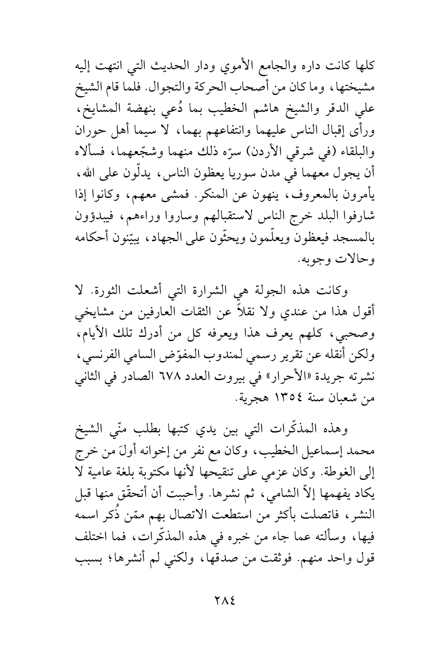 وكانت هذه الجولة هي الشرارة التي أشعلت الثورة. لا أقول هذا من عندي ولا نقلاً عن الثقات العارفين من مشايخي وصحبي، كلهم يعرف هذا ويعرفه كل من أدرك تلك الأيام، ولكن أنقله عن تقرير رسمي لمندوب المفوّض السامي الفرنسي، نشرته جريدة «الأحرار» في بيروت العدد 678 الصادر في الثاني من شعبان سنة 1354 هجرية.