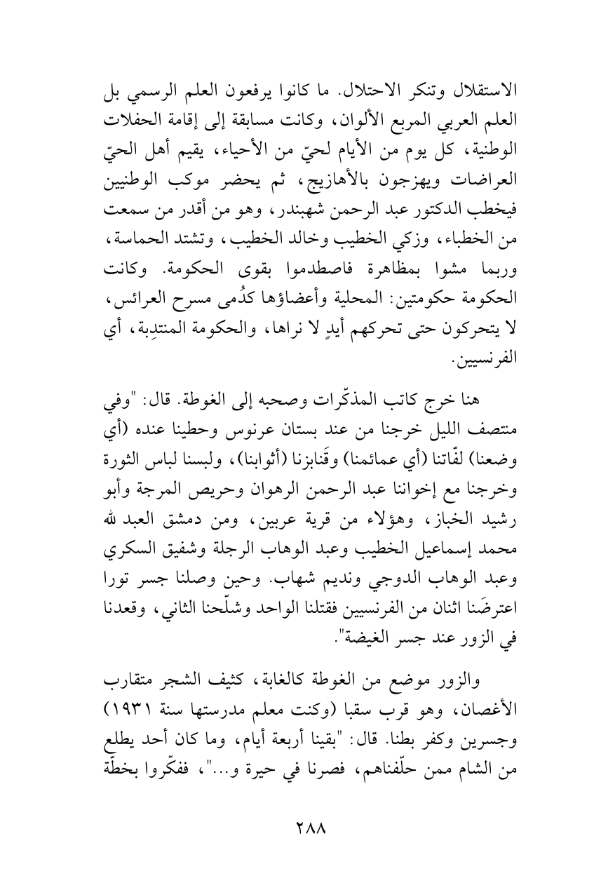 الاستقلال وتنكر الاحتلال. ما كانوا يرفعون العلم الرسمي بل العلم العربي المربع الألوان، وكانت مسابقة إلى إقامة الحفلات الوطنية، كل يوم من الأيام لحيّ من الأحياء، يقيم أهل الحيّ العراضات ويهزجون بالأهازيج، ثم يحضر موكب الوطنيين فيخطب الدكتور عبد الرحمن شهبندر، وهو من أقدر من سمعت من الخطباء، وزكي الخطيب وخالد الخطيب، وتشتد الحماسة، وربما مشوا بمظاهرة فاصطدموا بقوى الحكومة. وكانت الحكومة حكومتين: المحلية وأعضاؤها كدُمى مسرح العرائس، لا يتحركون حتى تحركهم أيدٍ لا نراها، والحكومة المنتدِبة، أي الفرنسيين.