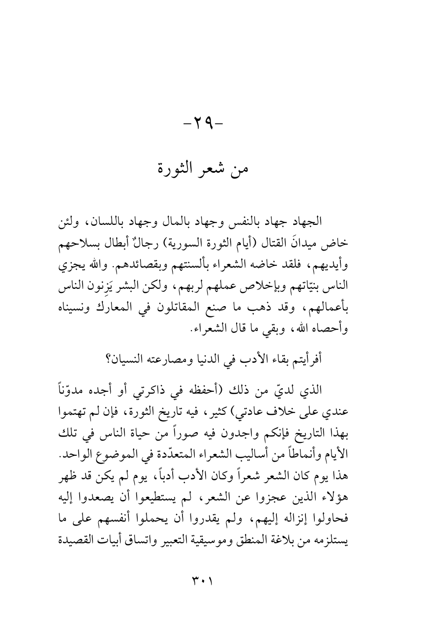 الذي لديّ من ذلك (أحفظه في ذاكرتي أو أجده مدوّناً عندي على خلاف عادتي) كثير، فيه تاريخ الثورة، فإن لم تهتموا بهذا التاريخ فإنكم واجدون فيه صوراً من حياة الناس في تلك الأيام وأنماطاً من أساليب الشعراء المتعدّدة في الموضوع الواحد. هذا يوم كان الشعر شعراً وكان الأدب أدباً، يوم لم يكن قد ظهر هؤلاء الذين عجزوا عن الشعر، لم يستطيعوا أن يصعدوا إليه فحاولوا إنزاله إليهم، ولم يقدروا أن يحملوا أنفسهم على ما يستلزمه من بلاغة المنطق وموسيقية التعبير واتساق أبيات القصيدة