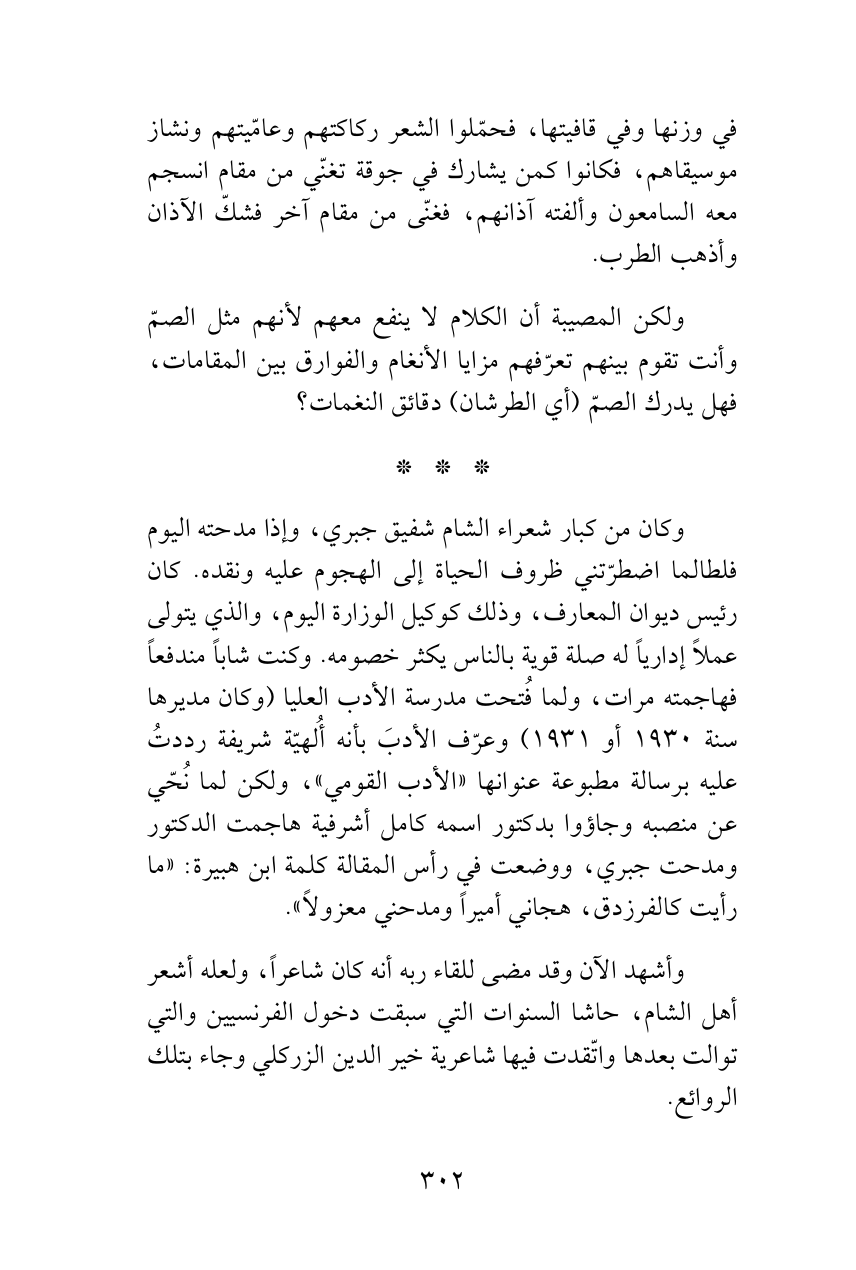 وكان من كبار شعراء الشام شفيق جبري، وإذا مدحته اليوم فلطالما اضطرّتني ظروف الحياة إلى الهجوم عليه ونقده. كان رئيس ديوان المعارف، وذلك كوكيل الوزارة اليوم، والذي يتولى عملاً إدارياً له صلة قوية بالناس يكثر خصومه. وكنت شاباً مندفعاً فهاجمته مرات، ولما فُتحت مدرسة الأدب العليا (وكان مديرها سنة 1930 أو 1931) وعرّف الأدبَ بأنه أُلهيّة شريفة رددتُ عليه برسالة مطبوعة عنوانها «الأدب القومي»، ولكن لما نُحّي عن منصبه وجاؤوا بدكتور اسمه كامل أشرفية هاجمت الدكتور ومدحت جبري، ووضعت في رأس المقالة كلمة ابن هبيرة: «ما رأيت كالفرزدق، هجاني أميراً ومدحني معزولاً».