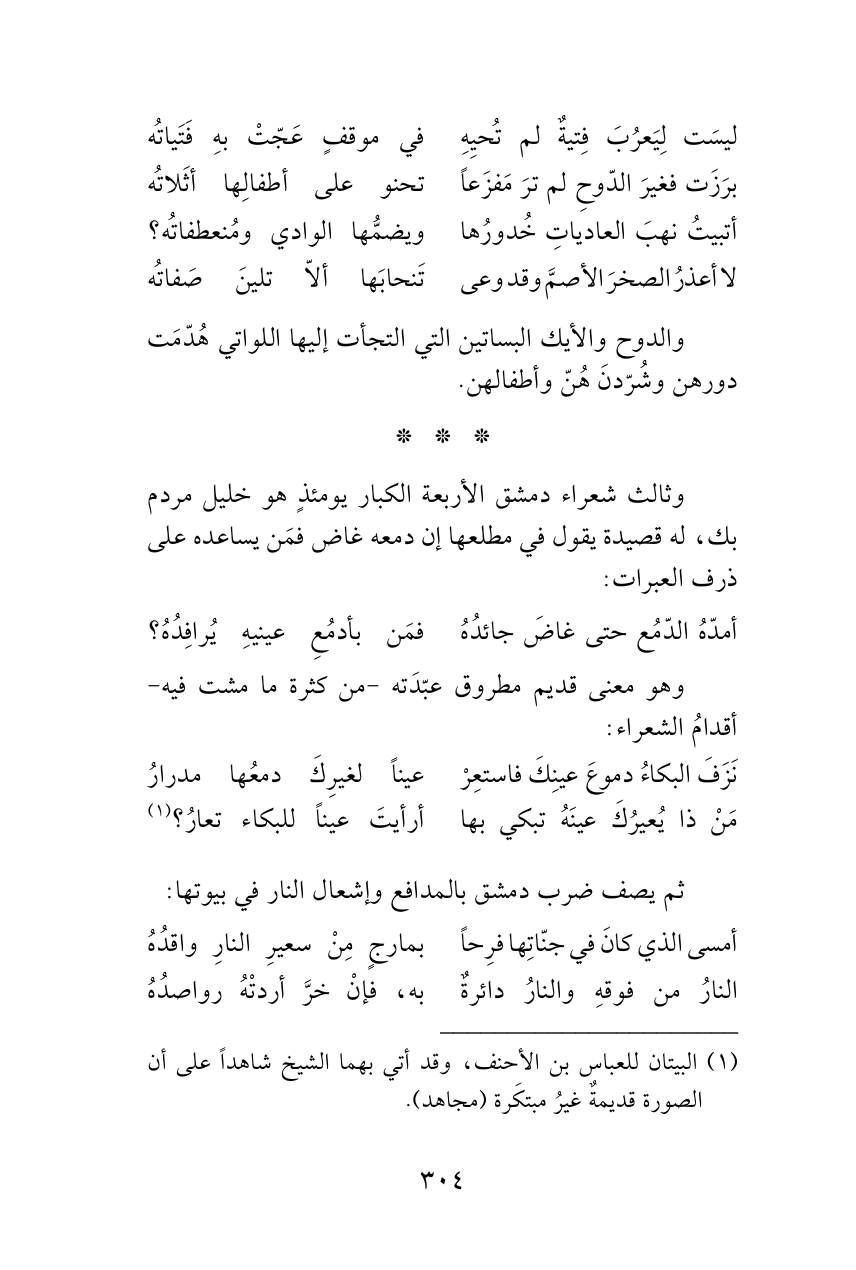 وثالث شعراء دمشق الأربعة الكبار يومئذٍ هو خليل مردم بك، له قصيدة يقول في مطلعها إن دمعه غاض فمَن يساعده على ذرف العبرات: