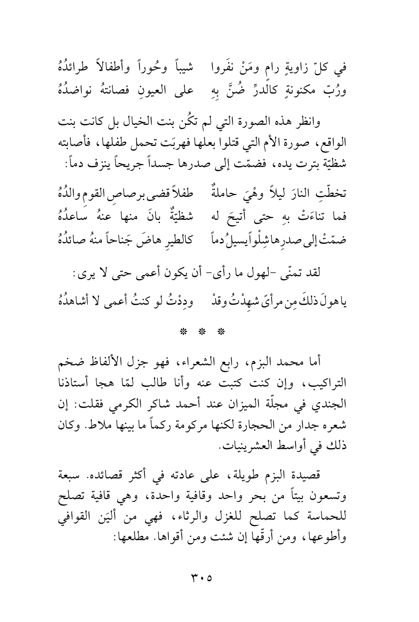 أما محمد البزم، رابع الشعراء، فهو جزل الألفاظ ضخم التراكيب، وإن كنت كتبت عنه وأنا طالب لمّا هجا أستاذنا الجندي في مجلّة الميزان عند أحمد شاكر الكرمي فقلت: إن شعره جدار من الحجارة لكنها مركومة ركماً ما بينها ملاط. وكان ذلك في أواسط العشرينيات.