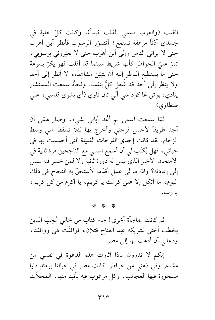 لمّا سمعت اسمي لم أعُد أبالي بشيء، وصار همّي أن أجد طريقاً لأحمل فرحتي وأخرج بها لئلاّ تسقط مني وسط الزحام. لقد كانت إحدى الفرحات القليلة التي أحسست بها في حياتي، فهل يُكتَب لي أن أسمع اسمي مع الناجحين مرة ثانية في الامتحان الأخير الذي ليس له دورة ثانية ولا لمن خسر فيه سبيل إلى إعادته؟ والله ما لي عمل أقدّمه لأستحقّ به النجاح في ذلك اليوم، ما أتكل إلاّ على كرمك يا كريم، يا أكرم من كل كريم، يا رب.