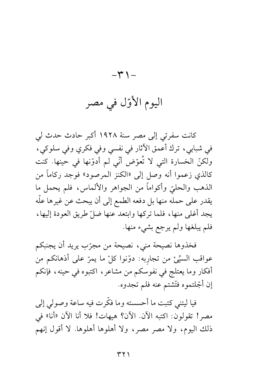 كانت سفرتي إلى مصر سنة 1928 أكبر حادث حدث لي في شبابي، ترك أعمق الآثار في نفسي وفي فكري وفي سلوكي، ولكنّ الخسارة التي لا تُعوّض أنّي لم أدوّنها في حينها. كنت كالذي زعموا أنه وصل إلى «الكنز المرصود» فوجد ركاماً من الذهب والحليّ وأكواماً من الجواهر والألماس، فلم يحمل ما يقدر على حمله منها بل دفعه الطمع إلى أن يبحث عن غيرها علّه يجد أغلى منها، فلما تركها وابتعد عنها ضلّ طريق العودة إليها، فلم يبلغها ولم يرجع بشيء منها.
