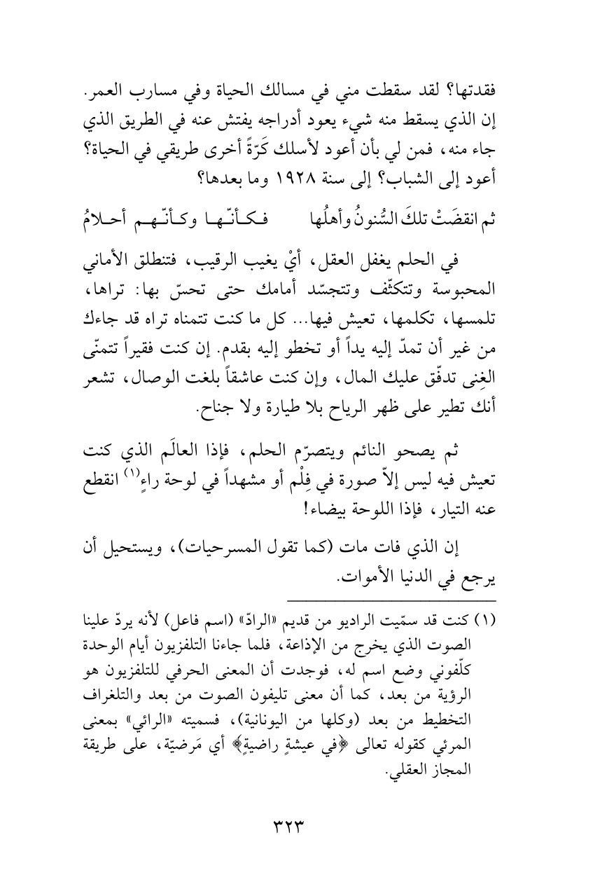 فقدتها؟ لقد سقطت مني في مسالك الحياة وفي مسارب العمر. إن الذي يسقط منه شيء يعود أدراجه يفتش عنه في الطريق الذي جاء منه، فمن لي بأن أعود لأسلك كَرّةً أخرى طريقي في الحياة؟ أعود إلى الشباب؟ إلى سنة 1928 وما بعدها؟