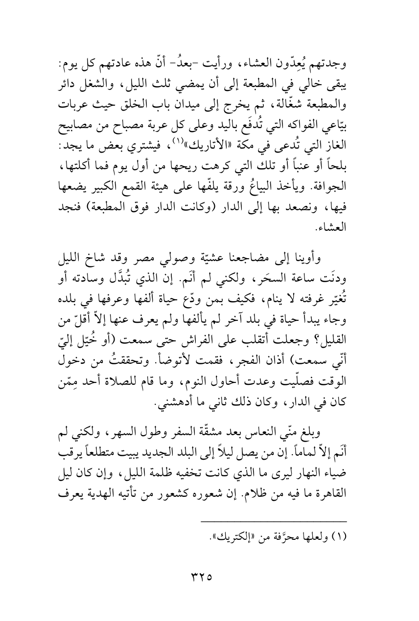 وأوينا إلى مضاجعنا عشيّة وصولي مصر وقد شاخ الليل ودنَت ساعة السحَر، ولكني لم أنَم. إن الذي تُبدَّل وسادته أو تُغيّر غرفته لا ينام، فكيف بمن ودّع حياة ألفها وعرفها في بلده وجاء يبدأ حياة في بلد آخر لم يألفها ولم يعرف عنها إلاّ أقلّ من القليل؟ وجعلت أتقلب على الفراش حتى سمعت (أو خُيّل إليّ أنّي سمعت) أذان الفجر، فقمت لأتوضأ. وتحققتُ من دخول الوقت فصلّيت وعدت أحاول النوم، وما قام للصلاة أحد مِمّن كان في الدار، وكان ذلك ثاني ما أدهشني.
