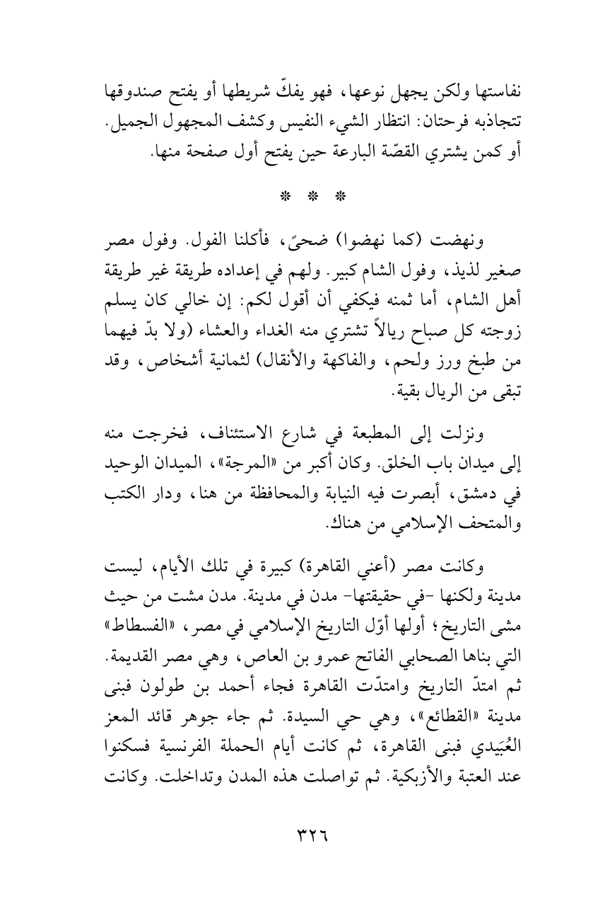 وكانت مصر (أعني القاهرة) كبيرة في تلك الأيام، ليست مدينة ولكنها -في حقيقتها- مدن في مدينة. مدن مشت من حيث مشى التاريخ؛ أولها أوّل التاريخ الإسلامي في مصر، «الفسطاط» التي بناها الصحابي الفاتح عمرو بن العاص، وهي مصر القديمة. ثم امتدّ التاريخ وامتدّت القاهرة فجاء أحمد بن طولون فبنى مدينة «القطائع»، وهي حي السيدة. ثم جاء جوهر قائد المعز العُبَيدي فبنى القاهرة، ثم كانت أيام الحملة الفرنسية فسكنوا عند العتبة والأزبكية. ثم تواصلت هذه المدن وتداخلت. وكانت