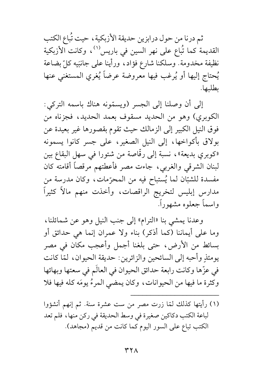 (¬1) رأيتها كذلك لمّا زرت مصر من ست عشرة سنة. ثم إنهم أنشؤوا لباعة الكتب دكاكين صغيرة في وسط الحديقة في ركن منها، فلم تعد الكتب تباع على السور اليوم كما كانت من قديم (مجاهد).