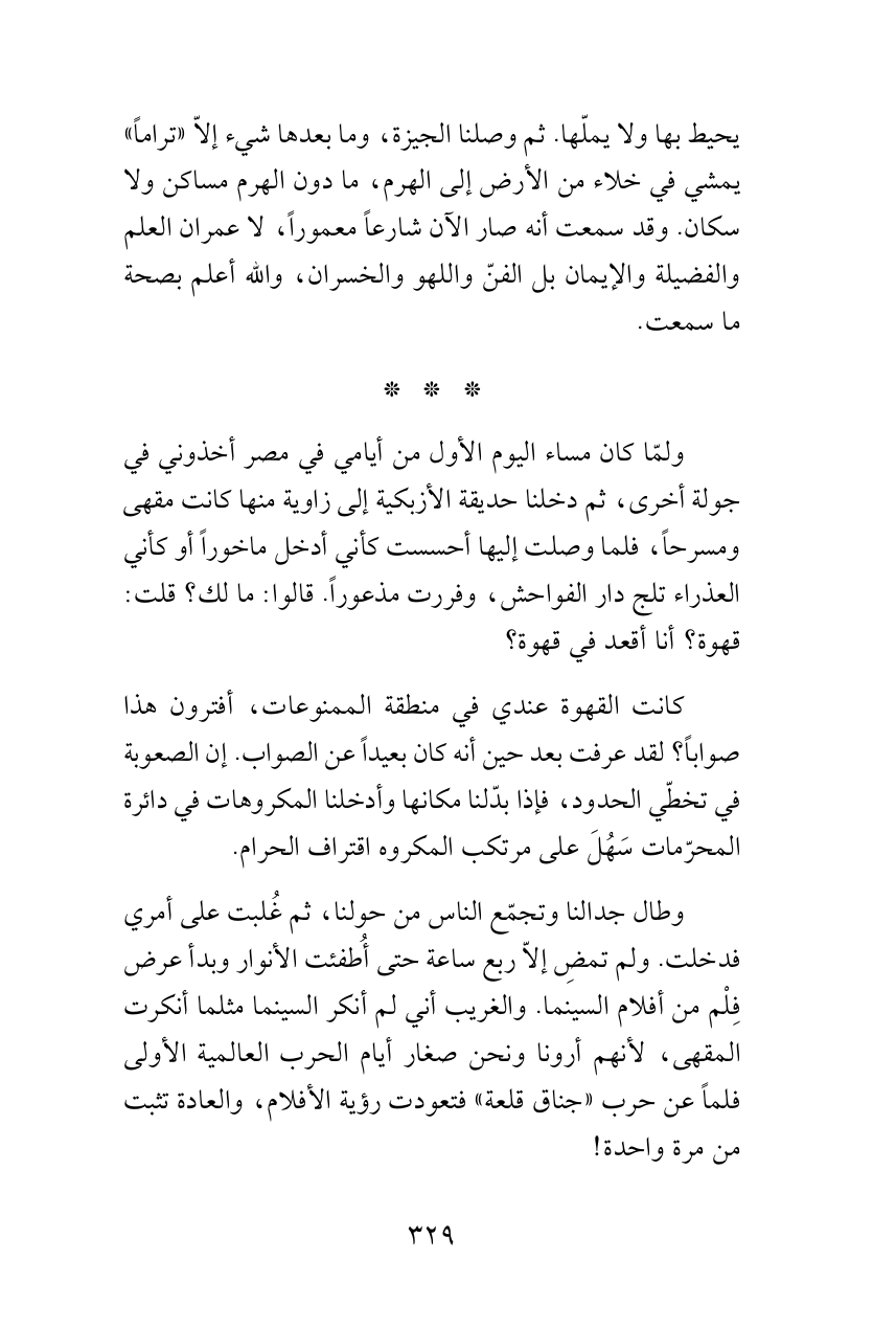 كانت القهوة عندي في منطقة الممنوعات، أفترون هذا صواباً؟ لقد عرفت بعد حين أنه كان بعيداً عن الصواب. إن الصعوبة في تخطّي الحدود، فإذا بدّلنا مكانها وأدخلنا المكروهات في دائرة المحرّمات سَهُلَ على مرتكب المكروه اقتراف الحرام.