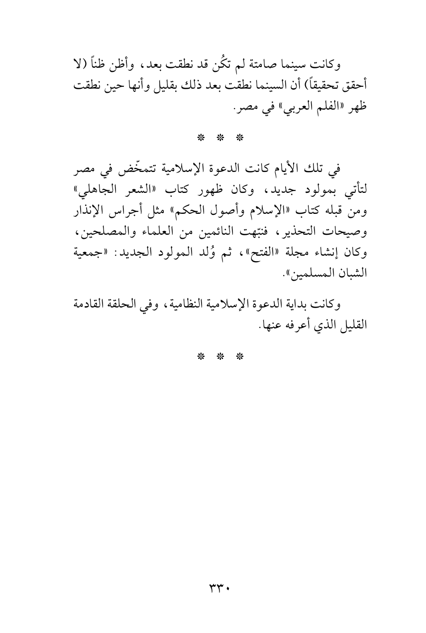 وكانت سينما صامتة لم تكُن قد نطقت بعد، وأظن ظناً (لا أحقق تحقيقاً) أن السينما نطقت بعد ذلك بقليل وأنها حين نطقت ظهر «الفلم العربي» في مصر.