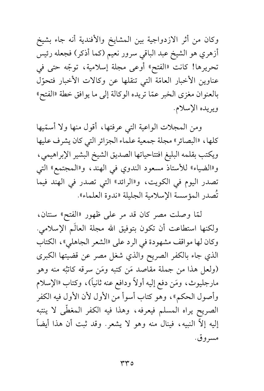 وكان من أثر الازدواجية بين المشايخ والأفندية أنه جاء بشيخ أزهري هو الشيخ عبد الباقي سرور نعيم (كما أذكر) فجعله رئيس تحريرها! كانت «الفتح» أوعى مجلة إسلامية، توجّه حتى في عناوين الأخبار العامّة التي تنقلها عن وكالات الأخبار فتحوّل بالعنوان مغزى الخبر عمّا تريده الوكالة إلى ما يوافق خطة «الفتح» ويريده الإسلام.