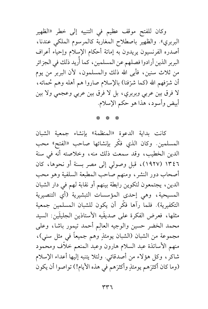 وكان للفتح موقف عظيم في التنبيه إلى خطر «الظهير البربري». والظهير باصطلاح المغاربة كالمرسوم الملكي عندنا، أصدره الفرنسيون يريدون به إماتة أحكام الإسلام وإحياء أعراف البربر الذين أرادوا فصلهم عن المسلمين، كما أُريد ذلك في الجزائر من ثلاث سنين، فأبى الله ذلك والمسلمون، لأن البربر من يوم أن شرّفهم الله (كما شرّفنا) بالإسلام صاروا هم أهله وهم حُماته، لا فرق بين عربي وبربري، بل لا فرق بين عربي وعجمي ولا بين أبيض وأسود، هذا هو حكم الإسلام.