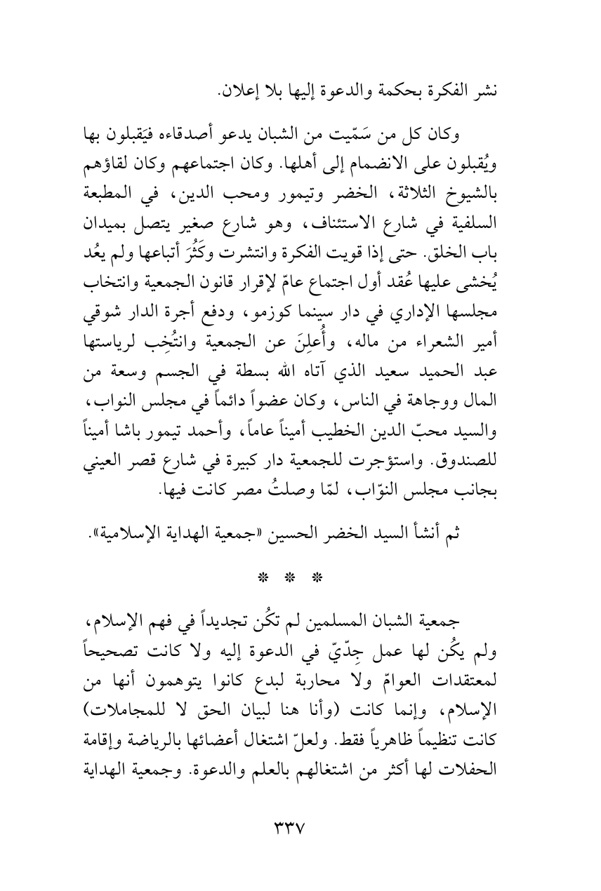 وكان كل من سَمّيت من الشبان يدعو أصدقاءه فيَقبلون بها ويُقبلون على الانضمام إلى أهلها. وكان اجتماعهم وكان لقاؤهم بالشيوخ الثلاثة، الخضر وتيمور ومحب الدين، في المطبعة السلفية في شارع الاستئناف، وهو شارع صغير يتصل بميدان باب الخلق. حتى إذا قويت الفكرة وانتشرت وكَثُرَ أتباعها ولم يعُد يُخشى عليها عُقد أول اجتماع عامّ لإقرار قانون الجمعية وانتخاب مجلسها الإداري في دار سينما كوزمو، ودفع أجرة الدار شوقي أمير الشعراء من ماله، وأُعلِنَ عن الجمعية وانتُخِب لرياستها عبدالحميد سعيد الذي آتاه الله بسطة في الجسم وسعة من المال ووجاهة في الناس، وكان عضواً دائماً في مجلس النواب، والسيد محبّ الدين الخطيب أميناً عاماً، وأحمد تيمور باشا أميناً للصندوق. واستؤجرت للجمعية دار كبيرة في شارع قصر العيني بجانب مجلس النوّاب، لمّا وصلتُ مصر كانت فيها.