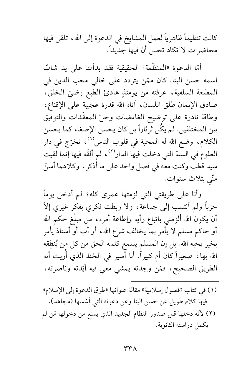أمّا الدعوة «المنظّمة» الحقيقية فقد بدأت على يد شابّ اسمه حسن البنا. كان ممّن يتردد على خالي محب الدين في المطبعة السلفية، عرفته من يومئذٍ هادئ الطبع رضيّ الخلق، صادق الإيمان طلق اللسان، آتاه الله قدرة عجيبة على الإقناع، وطاقة نادرة على توضيح الغامضات وحلّ المعقّدات والتوفيق بين المختلفين. لم يكُن ثرثاراً بل كان يحسن الإصغاء كما يحسن الكلام، وضع الله له المحبة في قلوب الناس (¬1)، تخرّج في دار العلوم في السنة التي دخلت فيها الدار (¬2)، لم ألقَه فيها إنما لقيت سيد قطب وكنت معه في فصل واحد على ما أذكر، وكلاهما أسنّ منّي بثلاث سنوات.