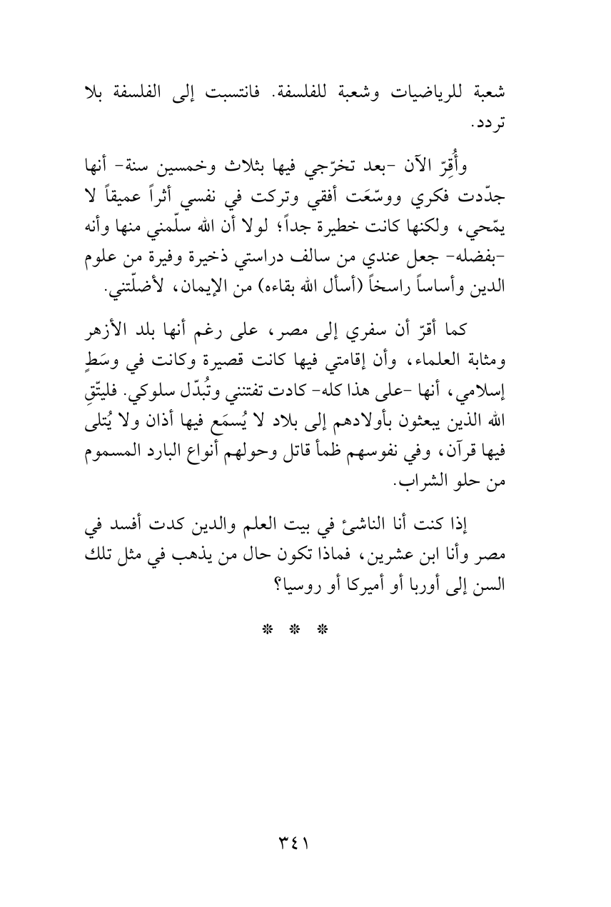 كما أقرّ أن سفري إلى مصر، على رغم أنها بلد الأزهر ومثابة العلماء، وأن إقامتي فيها كانت قصيرة وكانت في وسَطٍ إسلامي، أنها -على هذا كله- كادت تفتنني وتُبدّل سلوكي. فليتّقِ الله الذين يبعثون بأولادهم إلى بلاد لا يُسمَع فيها أذان ولا يُتلى فيها قرآن، وفي نفوسهم ظمأ قاتل وحولهم أنواع البارد المسموم من حلو الشراب.