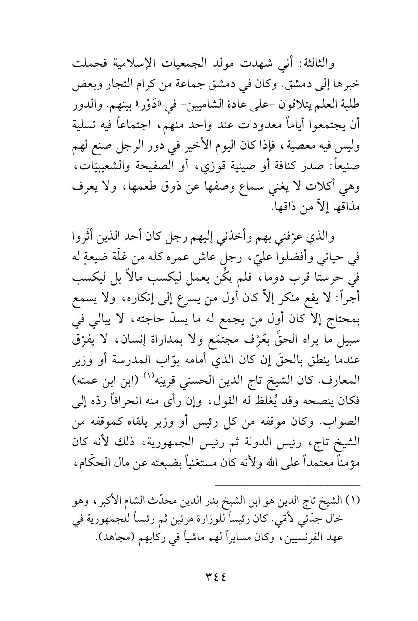 (¬1) الشيخ تاج الدين هو ابن الشيخ بدر الدين محدّث الشام الأكبر، وهو خال جدّتي لأمّي. كان رئيساً للوزارة مرتين ثم رئيساً للجمهورية في عهد الفرنسيين، وكان مسايراً لهم ماشياً في ركابهم (مجاهد).