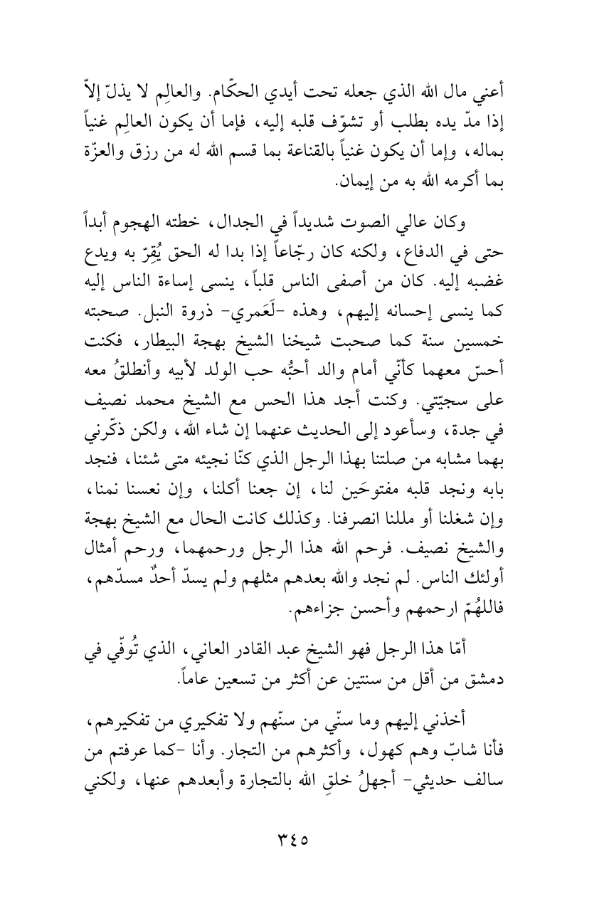 وكان عالي الصوت شديداً في الجدال، خطته الهجوم أبداً حتى في الدفاع، ولكنه كان رجّاعاً إذا بدا له الحق يُقِرّ به ويدع غضبه إليه. كان من أصفى الناس قلباً، ينسى إساءة الناس إليه كما ينسى إحسانه إليهم، وهذه -لَعَمري- ذروة النبل. صحبته خمسين سنة كما صحبت شيخنا الشيخ بهجة البيطار، فكنت أحسّ معهما كأنّي أمام والد أحبُّه حب الولد لأبيه وأنطلقُ معه على سجيّتي. وكنت أجد هذا الحس مع الشيخ محمد نصيف في جدة، وسأعود إلى الحديث عنهما إن شاء الله، ولكن ذكّرني بهما مشابه من صلتنا بهذا الرجل الذي كنّا نجيئه متى شئنا، فنجد بابه ونجد قلبه مفتوحَين لنا، إن جعنا أكلنا، وإن نعسنا نمنا، وإن شغلنا أو مللنا انصرفنا. وكذلك كانت الحال مع الشيخ بهجة والشيخ نصيف. فرحم الله هذا الرجل ورحمهما، ورحم أمثال أولئك الناس. لم نجد والله بعدهم مثلهم ولم يسدّ أحدٌ مسدّهم، فاللهُمّ ارحمهم وأحسن جزاءهم.