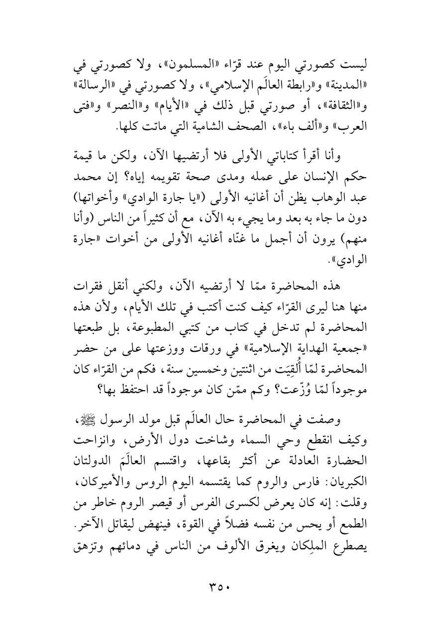 هذه المحاضرة ممّا لا أرتضيه الآن، ولكني أنقل فقرات منها هنا ليرى القرّاء كيف كنت أكتب في تلك الأيام، ولأن هذه المحاضرة لم تدخل في كتاب من كتبي المطبوعة، بل طبعتها «جمعية الهداية الإسلامية» في ورقات ووزعتها على من حضر المحاضرة لمّا أُلقِيَت من اثنتين وخمسين سنة، فكم من القرّاء كان موجوداً لمّا وُزّعت؟ وكم ممّن كان موجوداً قد احتفظ بها؟