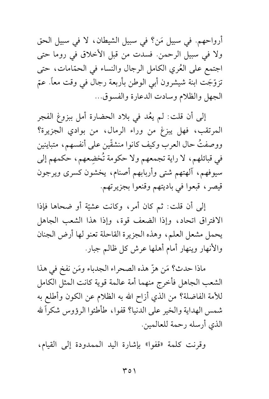 ماذا حدث؟ مَن هزّ هذه الصحراء الجدباء ومَن نفخ في هذا الشعب الجاهل فأخرج منهما أمة عالمة قوية كانت المثل الكامل للأمة الفاضلة؟ من الذي أزاح الله به الظلام عن الكون وأطلع به شمس الهداية والخير على الدنيا؟ قفوا، طأطئوا الرؤوس شكراً لله الذي أرسله رحمة للعالمين.
