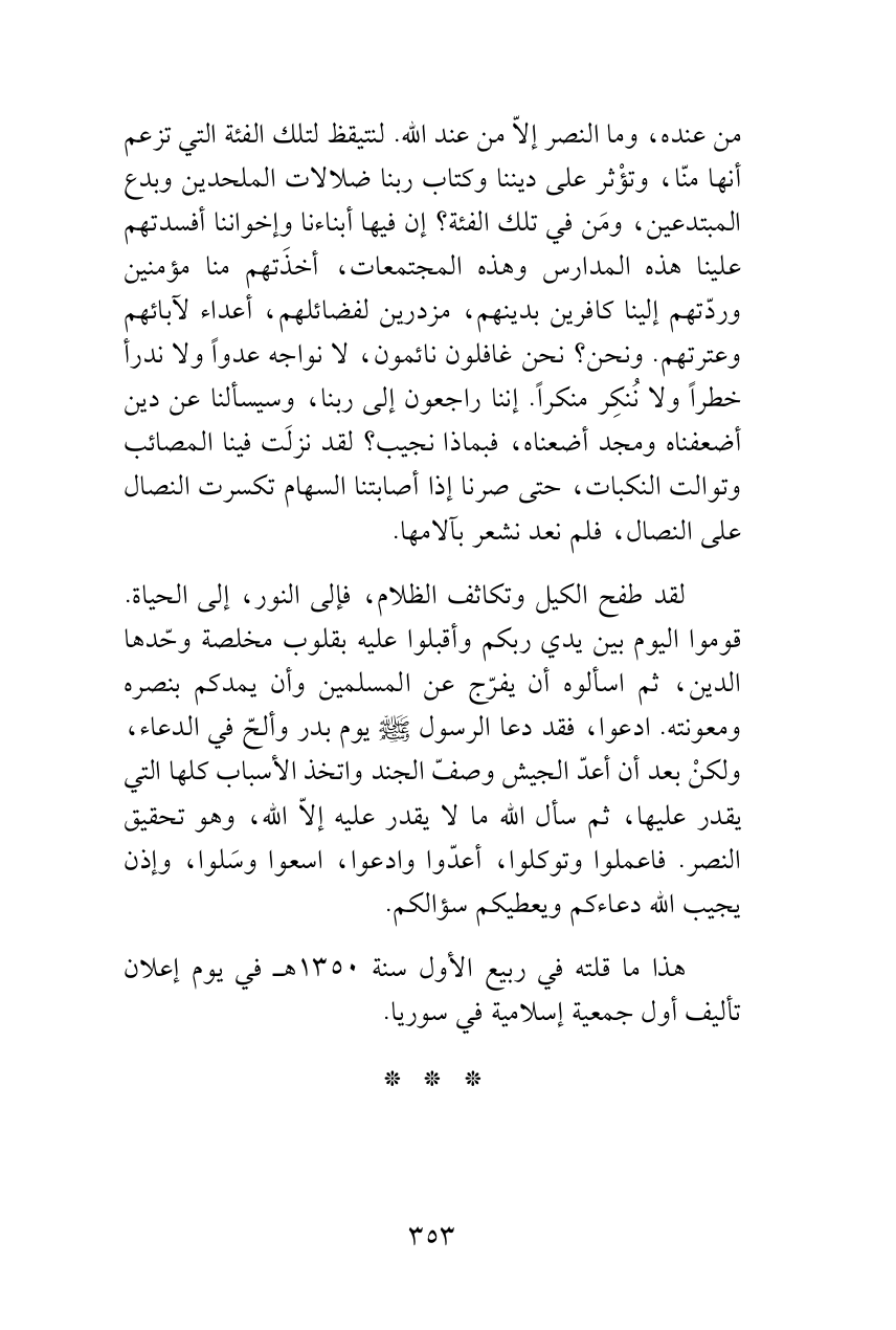 لقد طفح الكيل وتكاثف الظلام، فإلى النور، إلى الحياة. قوموا اليوم بين يدي ربكم وأقبلوا عليه بقلوب مخلصة وحّدها الدين، ثم اسألوه أن يفرّج عن المسلمين وأن يمدكم بنصره ومعونته. ادعوا، فقد دعا الرسول ‘ يوم بدر وألحّ في الدعاء، ولكنْ بعد أن أعدّ الجيش وصفّ الجند واتخذ الأسباب كلها التي يقدر عليها، ثم سأل الله ما لا يقدر عليه إلاّ الله، وهو تحقيق النصر. فاعملوا وتوكلوا، أعدّوا وادعوا، اسعوا وسَلوا، وإذن يجيب الله دعاءكم ويعطيكم سؤالكم.