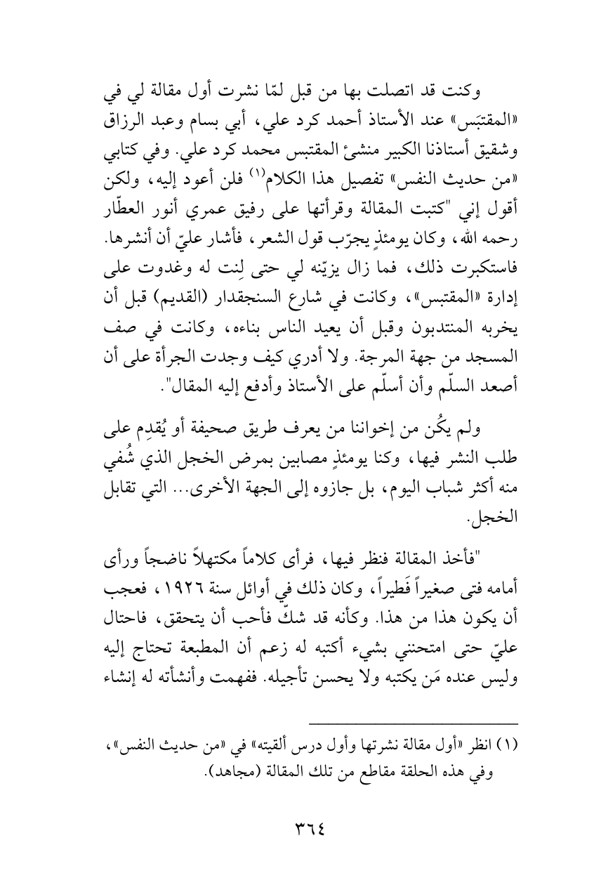 (¬1) انظر «أول مقالة نشرتها وأول درس ألقيته» في «من حديث النفس»، وفي هذه الحلقة مقاطع من تلك المقالة (مجاهد).