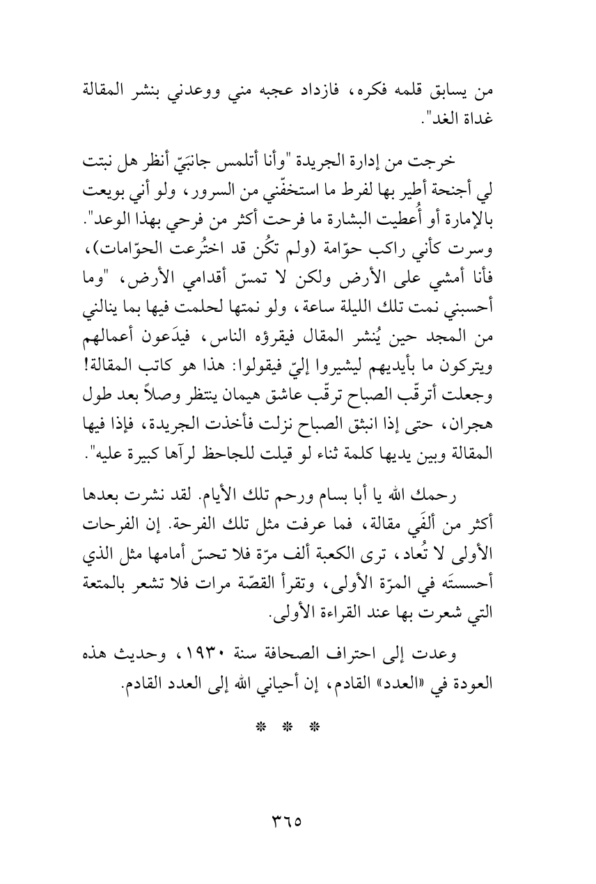 وعدت إلى احتراف الصحافة سنة 1930، وحديث هذه العودة في «العدد» القادم، إن أحياني الله إلى العدد القادم.