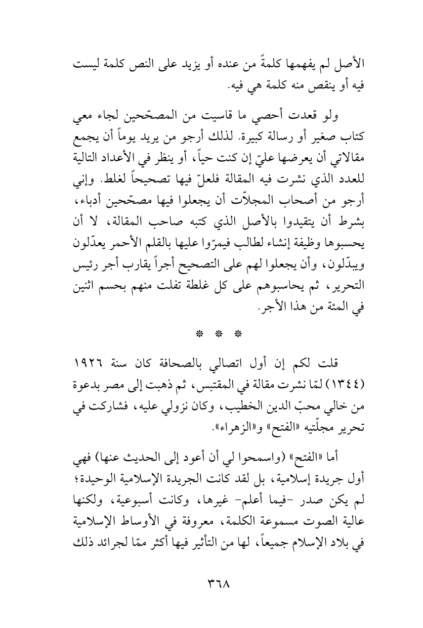 ولو قعدت أحصي ما قاسيت من المصحّحين لجاء معي كتاب صغير أو رسالة كبيرة. لذلك أرجو من يريد يوماً أن يجمع مقالاتي أن يعرضها عليّ إن كنت حياً، أو ينظر في الأعداد التالية للعدد الذي نشرت فيه المقالة فلعلّ فيها تصحيحاً لغلط. وإني أرجو من أصحاب المجلاّت أن يجعلوا فيها مصحّحين أدباء، بشرط أن يتقيدوا بالأصل الذي كتبه صاحب المقالة، لا أن يحسبوها وظيفة إنشاء لطالب فيمرّوا عليها بالقلم الأحمر يعدّلون ويبدّلون، وأن يجعلوا لهم على التصحيح أجراً يقارب أجر رئيس التحرير، ثم يحاسبوهم على كل غلطة تفلت منهم بحسم اثنين في المئة من هذا الأجر.