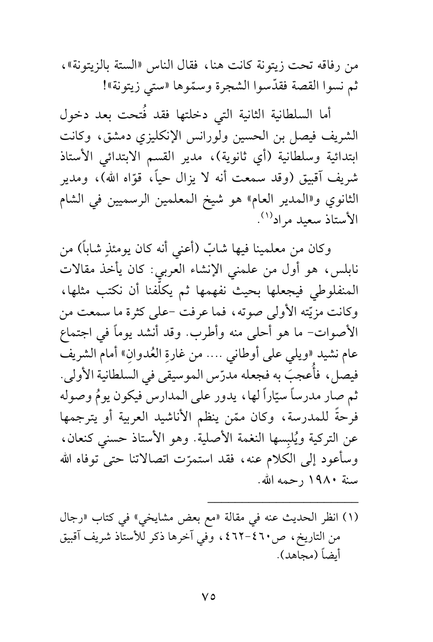أما السلطانية الثانية التي دخلتها فقد فُتحت بعد دخول الشريف فيصل بن الحسين ولورانس الإنكليزي دمشق، وكانت ابتدائية وسلطانية (أي ثانوية)، مدير القسم الابتدائي الأستاذ شريف آقبيق (وقد سمعت أنه لا يزال حياً، قوّاه الله)، ومدير الثانوي و «المدير العام» هو شيخ المعلمين الرسميين في الشام الأستاذ سعيد مراد (¬1).