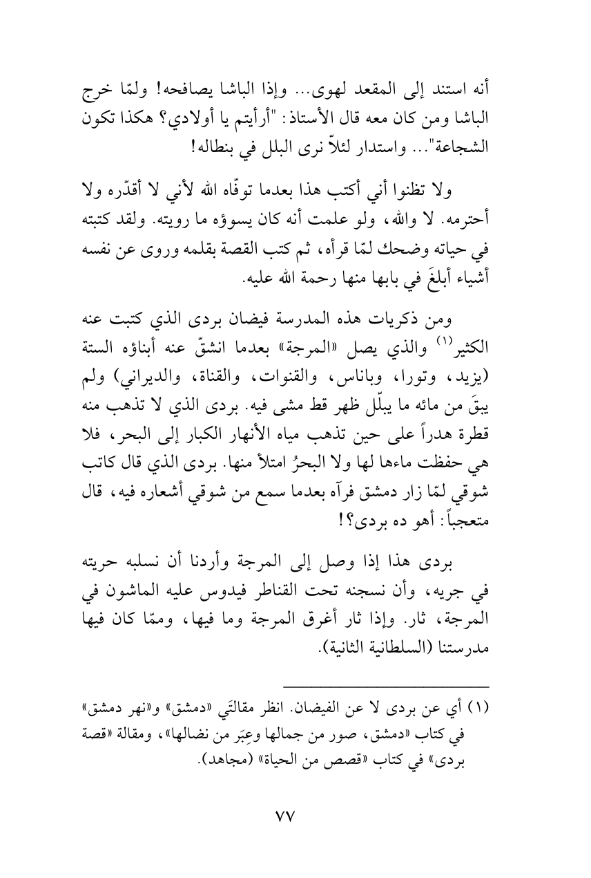 ومن ذكريات هذه المدرسة فيضان بردى الذي كتبت عنه الكثير (¬1) والذي يصل «المرجة» بعدما انشقّ عنه أبناؤه الستة (يزيد، وتورا، وباناس، والقنوات، والقناة، والديراني) ولم يبقَ من مائه ما يبلّل ظهر قط مشى فيه. بردى الذي لا تذهب منه قطرة هدراً على حين تذهب مياه الأنهار الكبار إلى البحر، فلا هي حفظت ماءها لها ولا البحرُ امتلأ منها. بردى الذي قال كاتب شوقي لمّا زار دمشق فرآه بعدما سمع من شوقي أشعاره فيه، قال متعجباً: أهو ده بردى؟!