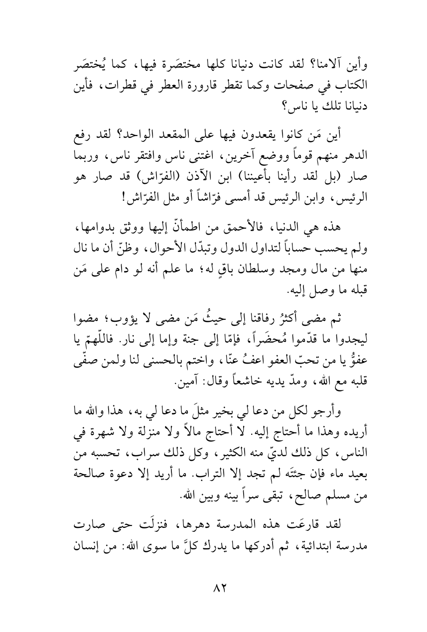 أين مَن كانوا يقعدون فيها على المقعد الواحد؟ لقد رفع الدهر منهم قوماً ووضع آخرين، اغتنى ناس وافتقر ناس، وربما صار (بل لقد رأينا بأعيننا) ابن الآذن (الفرّاش) قد صار هو الرئيس، وابن الرئيس قد أمسى فرّاشاً أو مثل الفرّاش!
