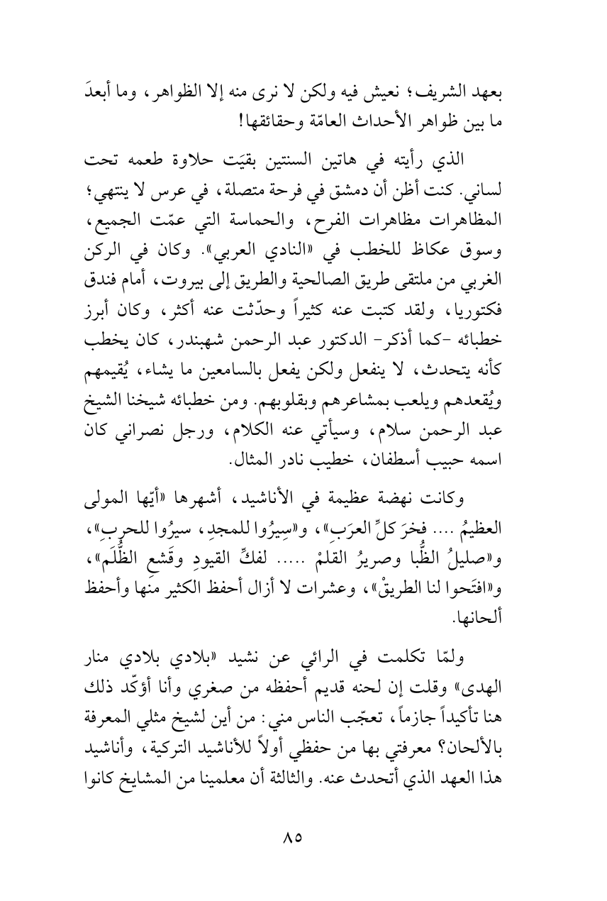 الذي رأيته في هاتين السنتين بقيَت حلاوة طعمه تحت لساني. كنت أظن أن دمشق في فرحة متصلة، في عرس لا ينتهي؛ المظاهرات مظاهرات الفرح، والحماسة التي عمّت الجميع، وسوق عكاظ للخطب في «النادي العربي». وكان في الركن الغربي من ملتقى طريق الصالحية والطريق إلى بيروت، أمام فندق فكتوريا، ولقد كتبت عنه كثيراً وحدّثت عنه أكثر، وكان أبرز خطبائه -كما أذكر- الدكتور عبد الرحمن شهبندر، كان يخطب كأنه يتحدث، لا ينفعل ولكن يفعل بالسامعين ما يشاء، يُقيمهم ويُقعدهم ويلعب بمشاعرهم وبقلوبهم. ومن خطبائه شيخنا الشيخ عبد الرحمن سلام، وسيأتي عنه الكلام، ورجل نصراني كان اسمه حبيب أسطفان، خطيب نادر المثال.